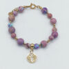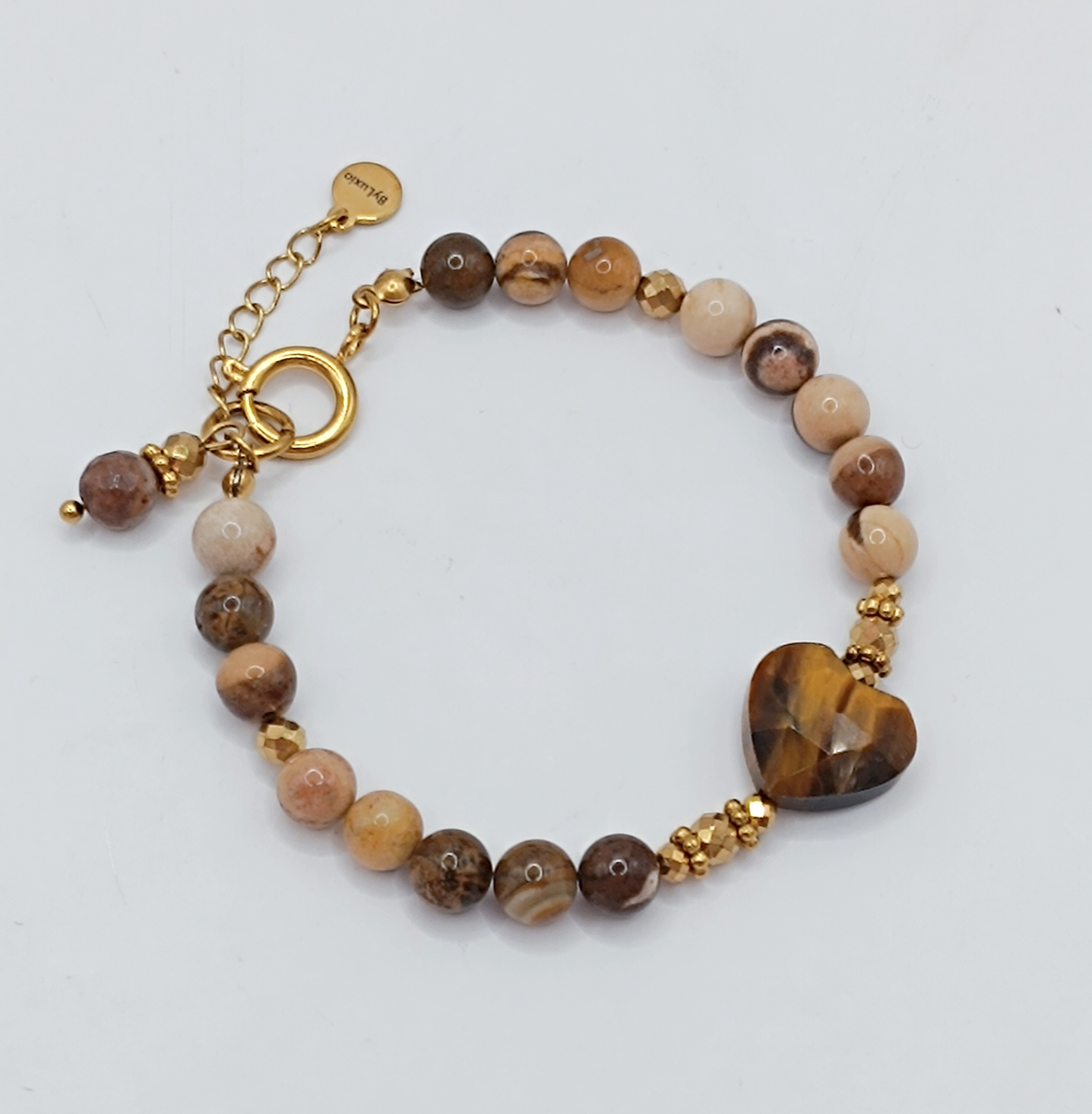 Bransoletka wykonana z kamieni Jaspisu 6mm i Tygrysiego Oka 8mm. Ozdobne złote przekładki to stal chirurgiczna i Hematyt