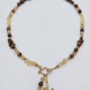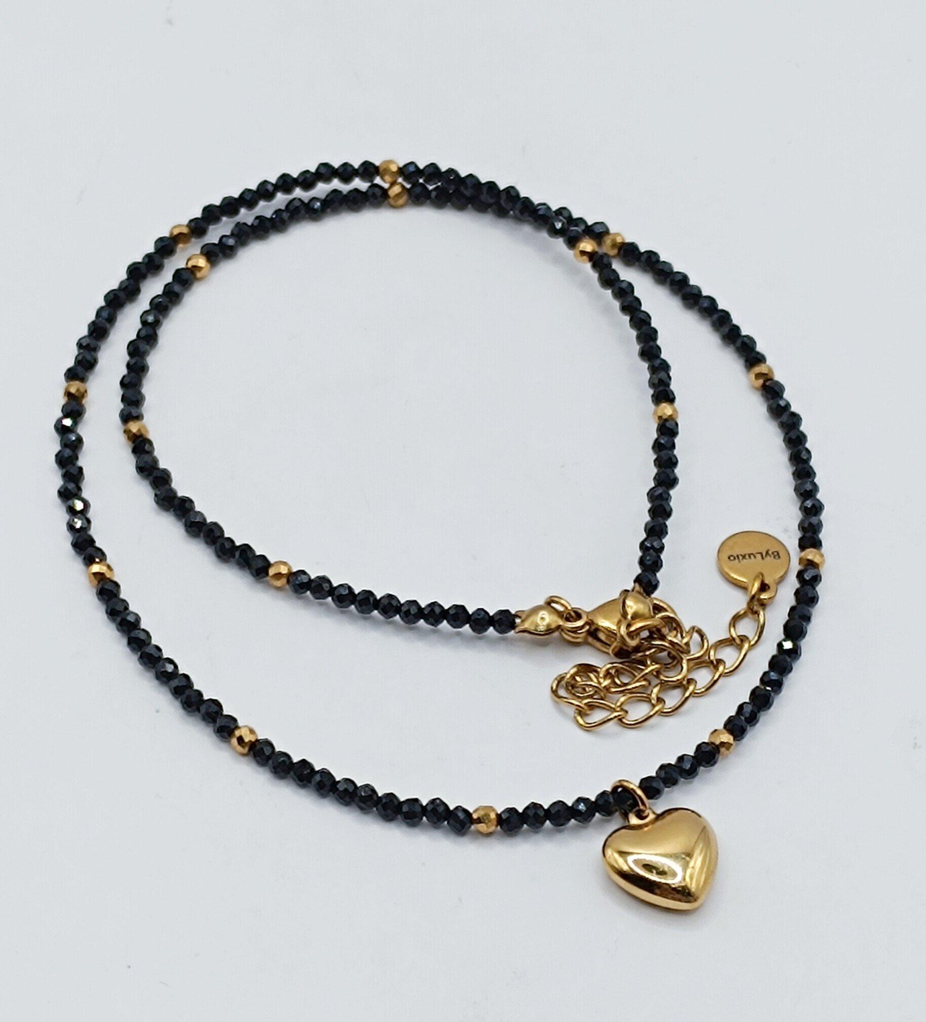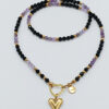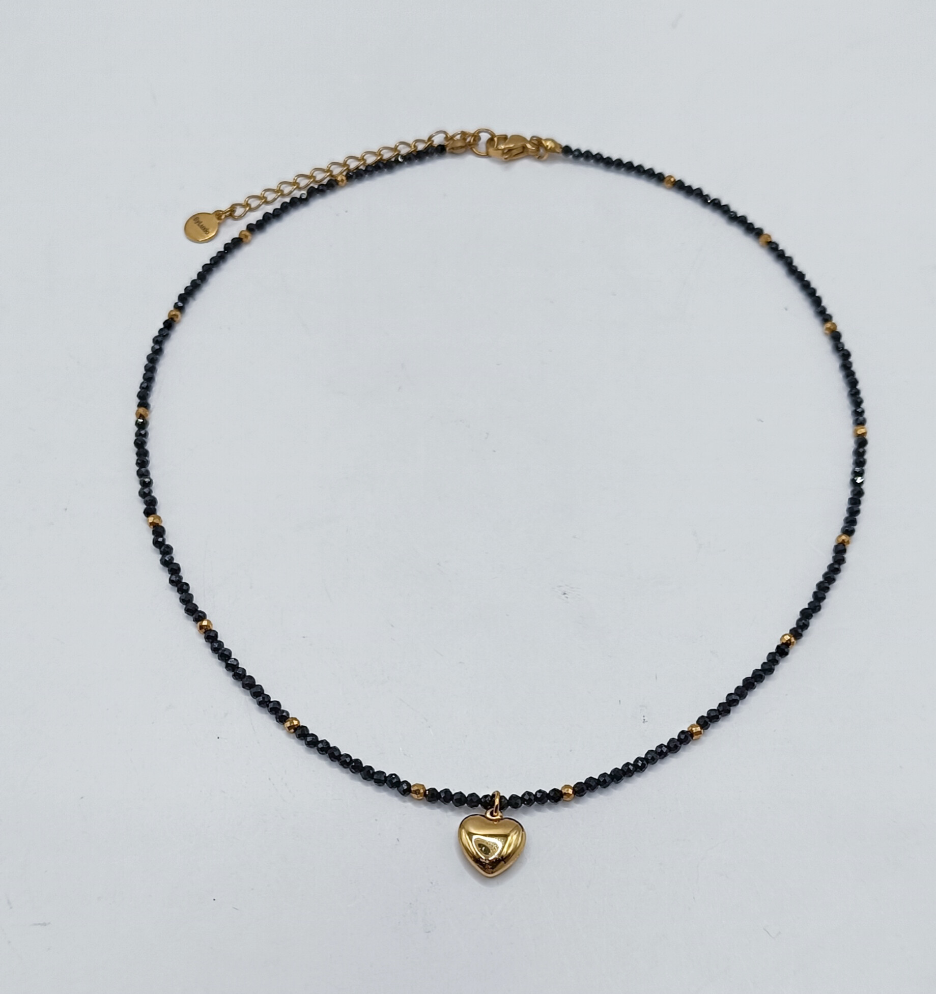 Naszyjnik wykonany z maleńkich kamieni Czarnego Turmalinu, złotych przekładek ze stali chirurgicznej i serduszka