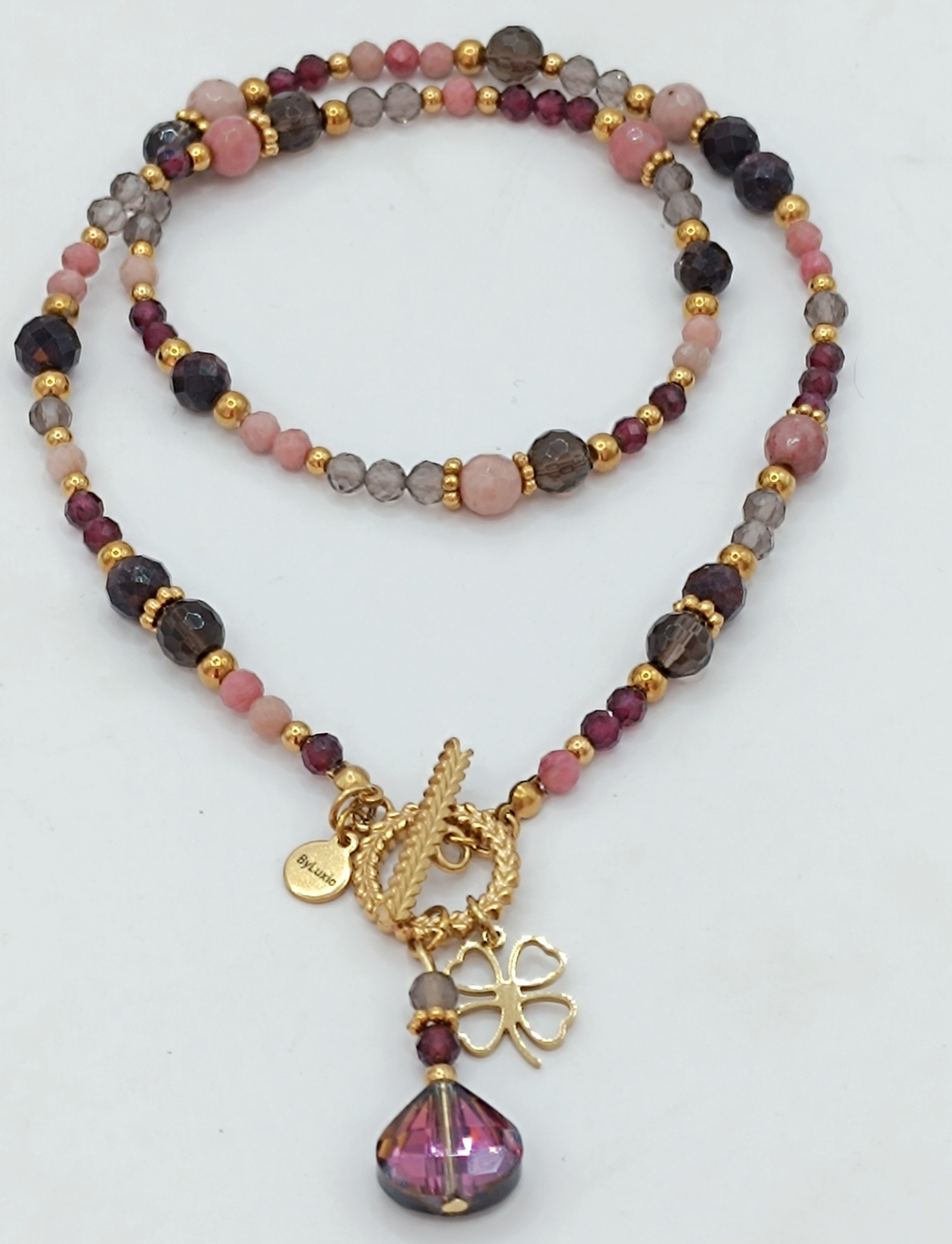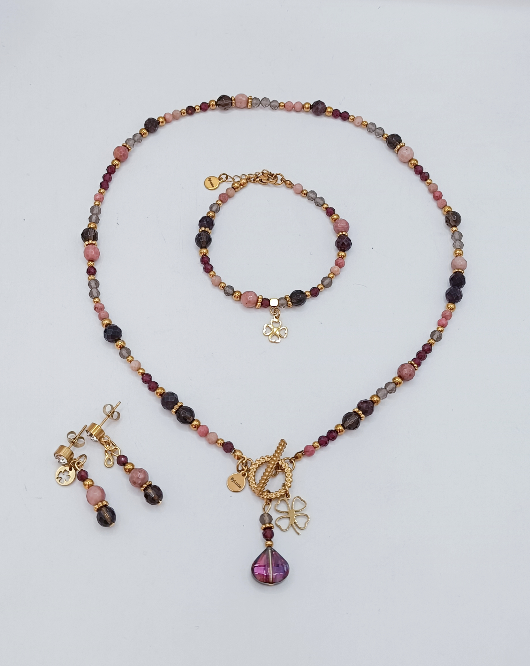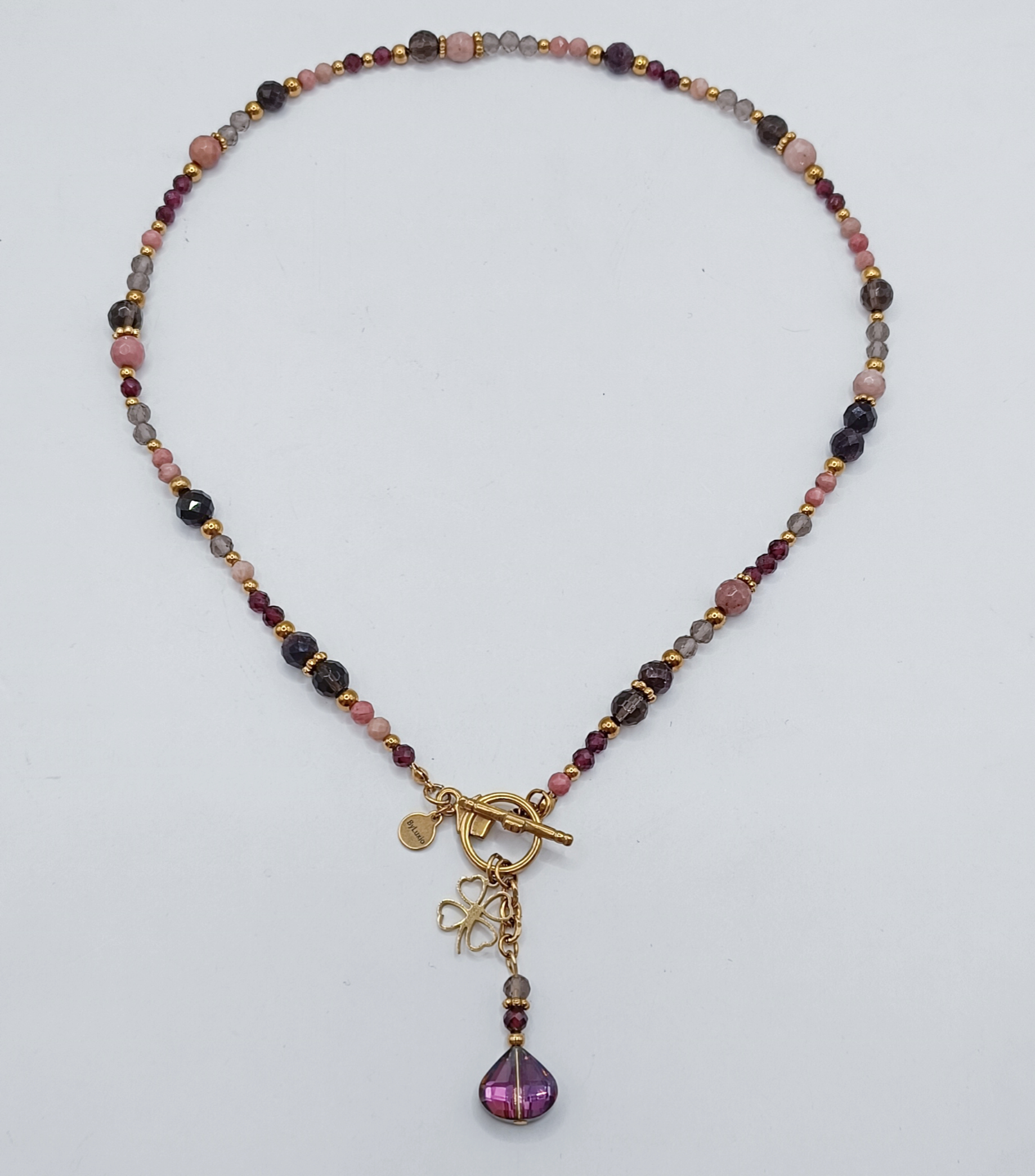 Naszyjnik wykonany z kamieni Granatu, Kwarcu Dymnego i Rodonitu wielkości 4mm i 6mm.