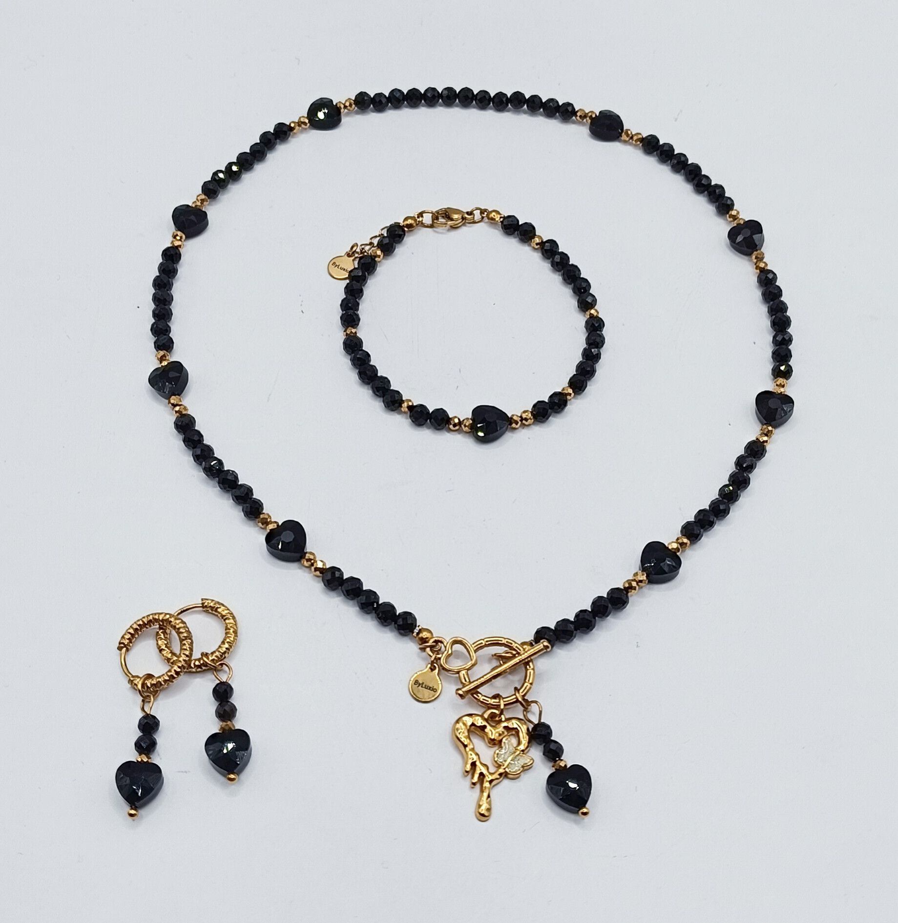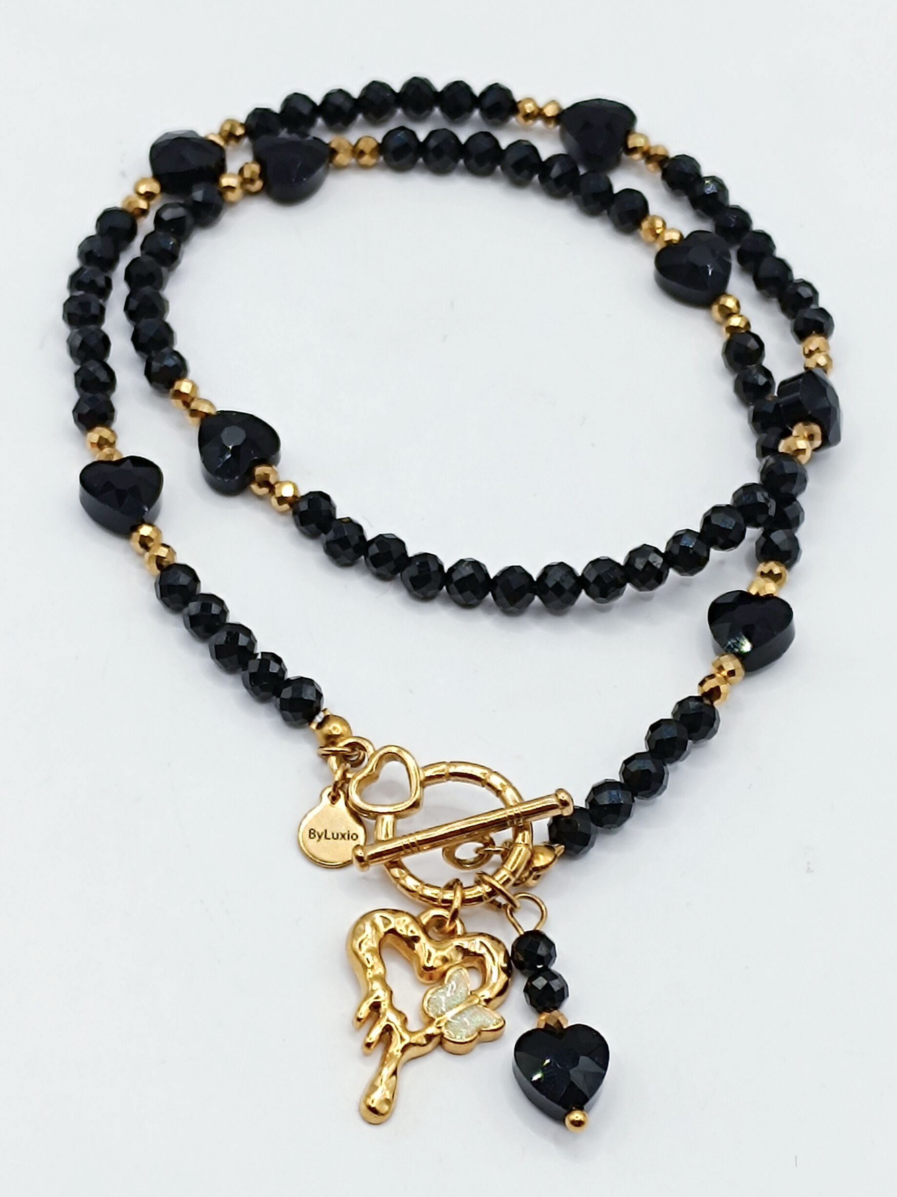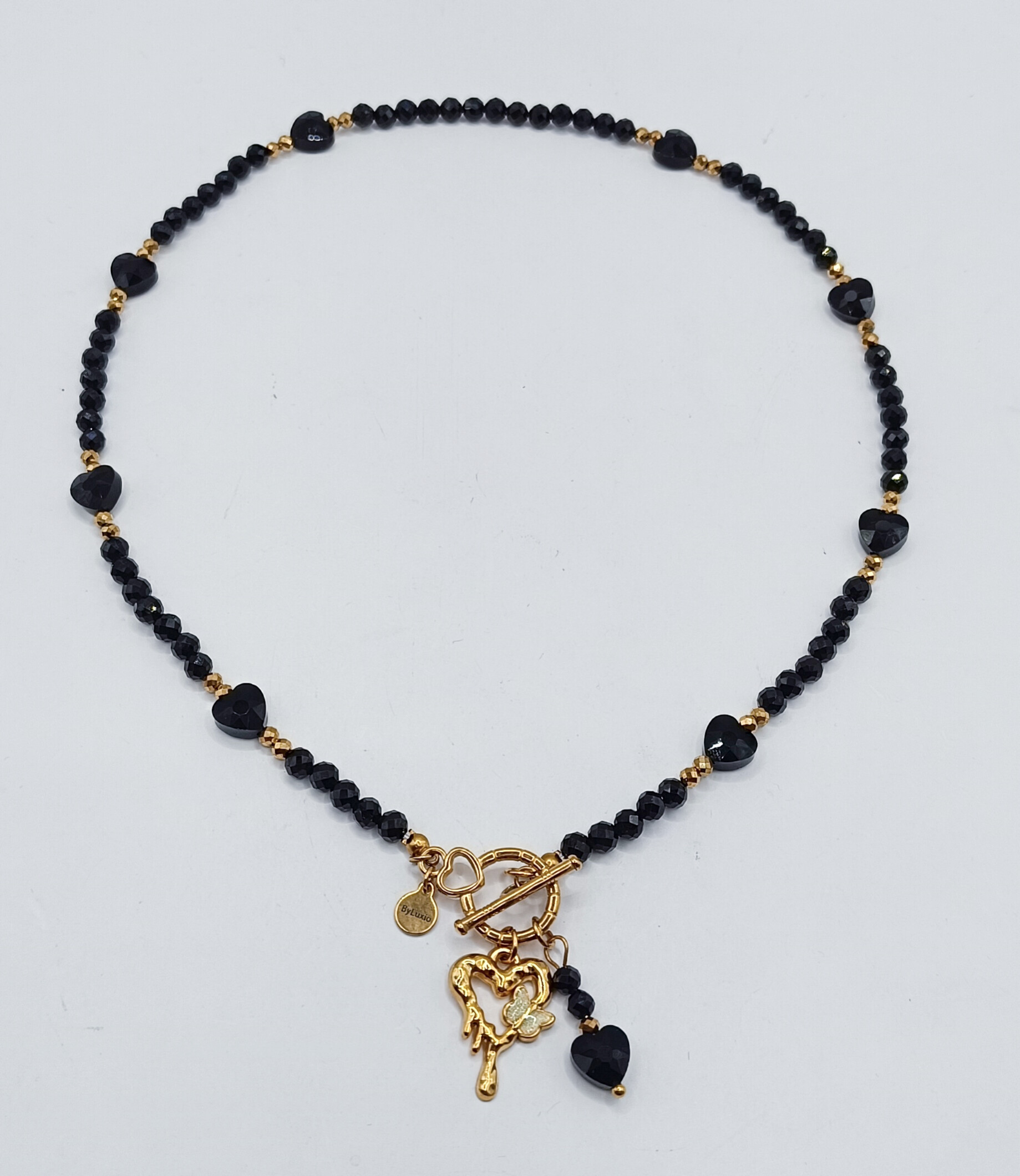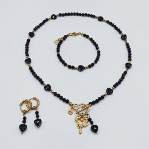 Naszyjnik wykonany z kamieni czarnego Turmalinu wielkości 4mm, złotych fasetowanych Hematytów 3mm i szklanych czarnych serduszek