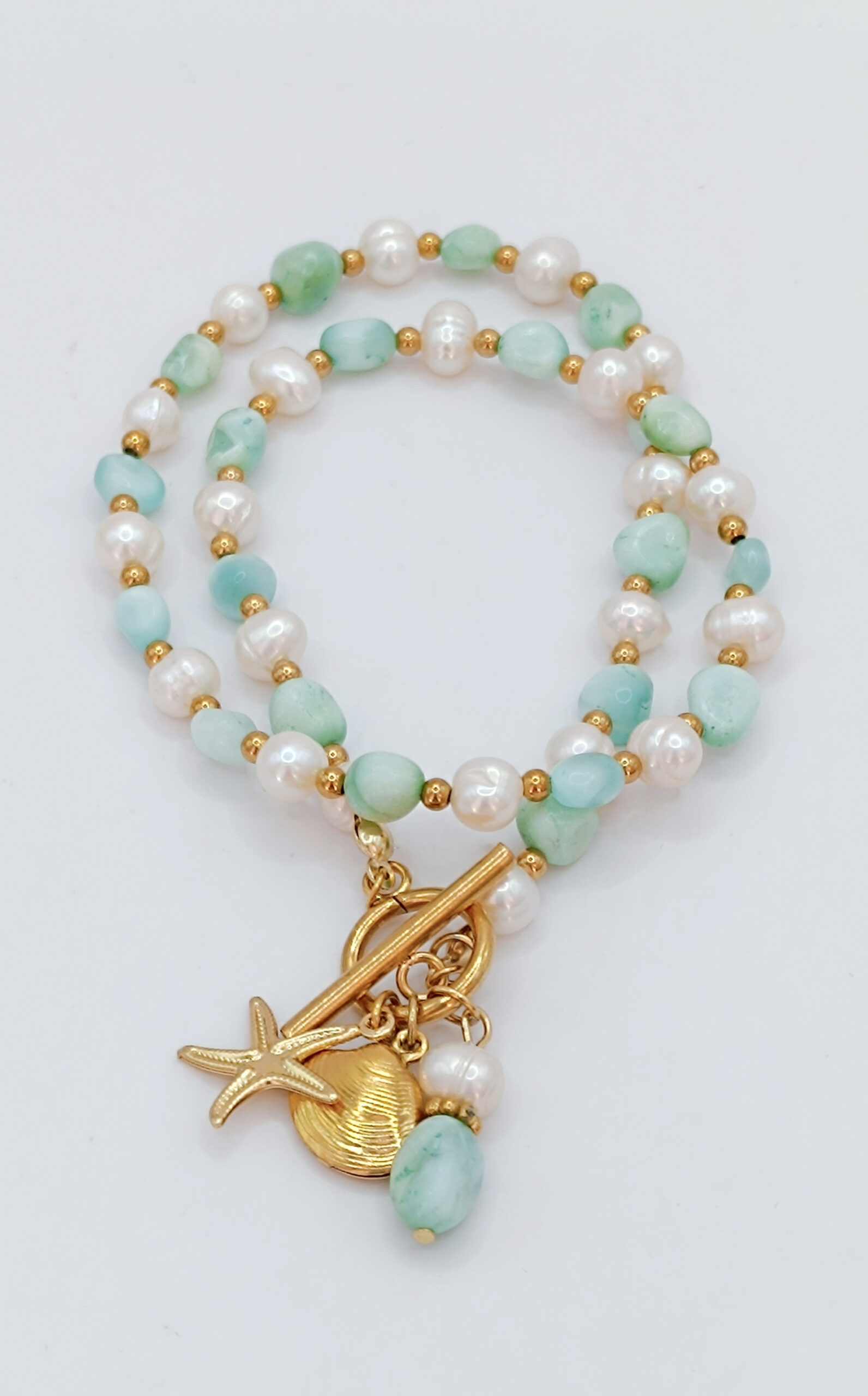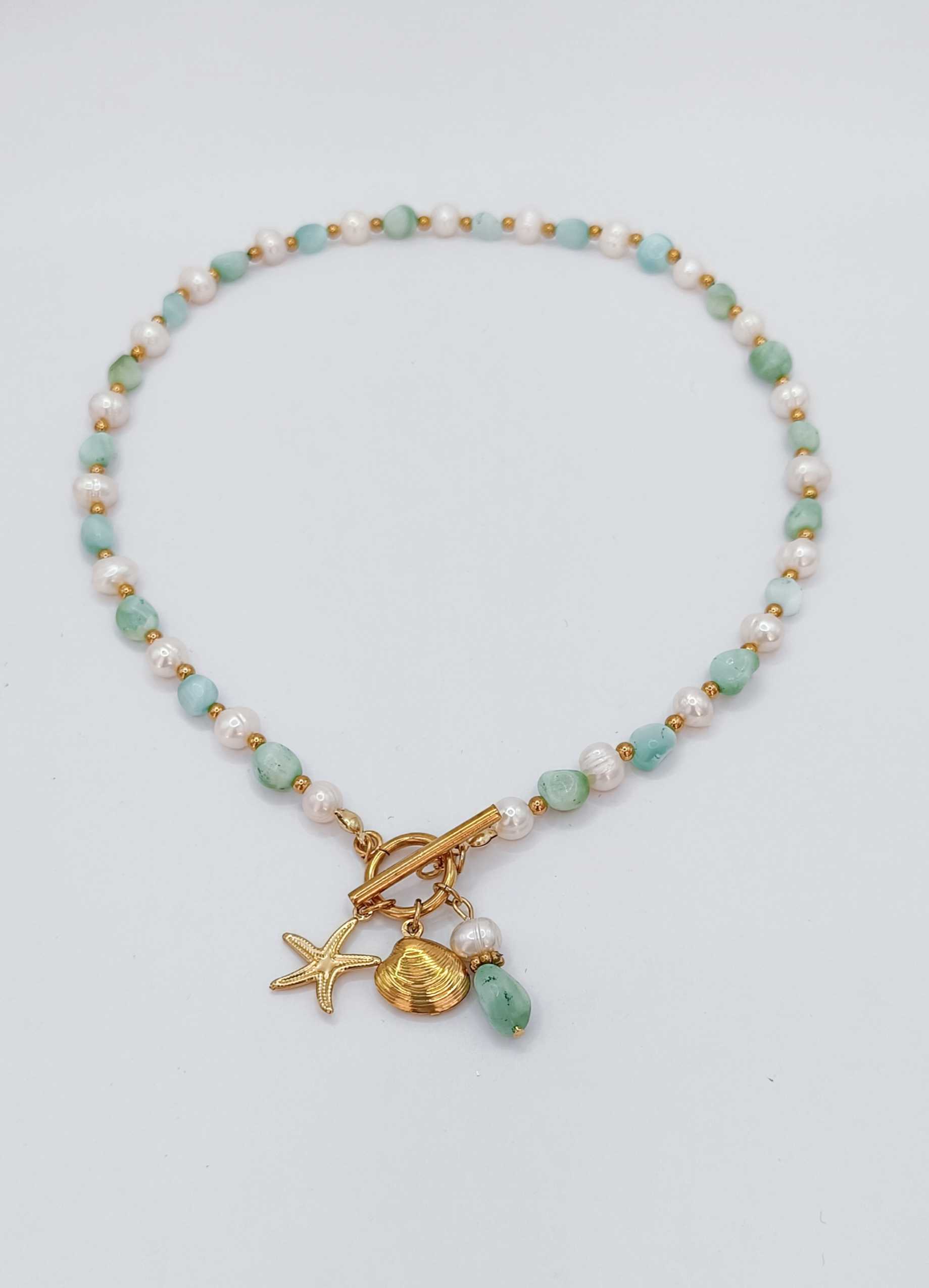 Naszyjnik wykonany z Naturalnych pereł słodkowodnych oraz kamieni Larimaru.