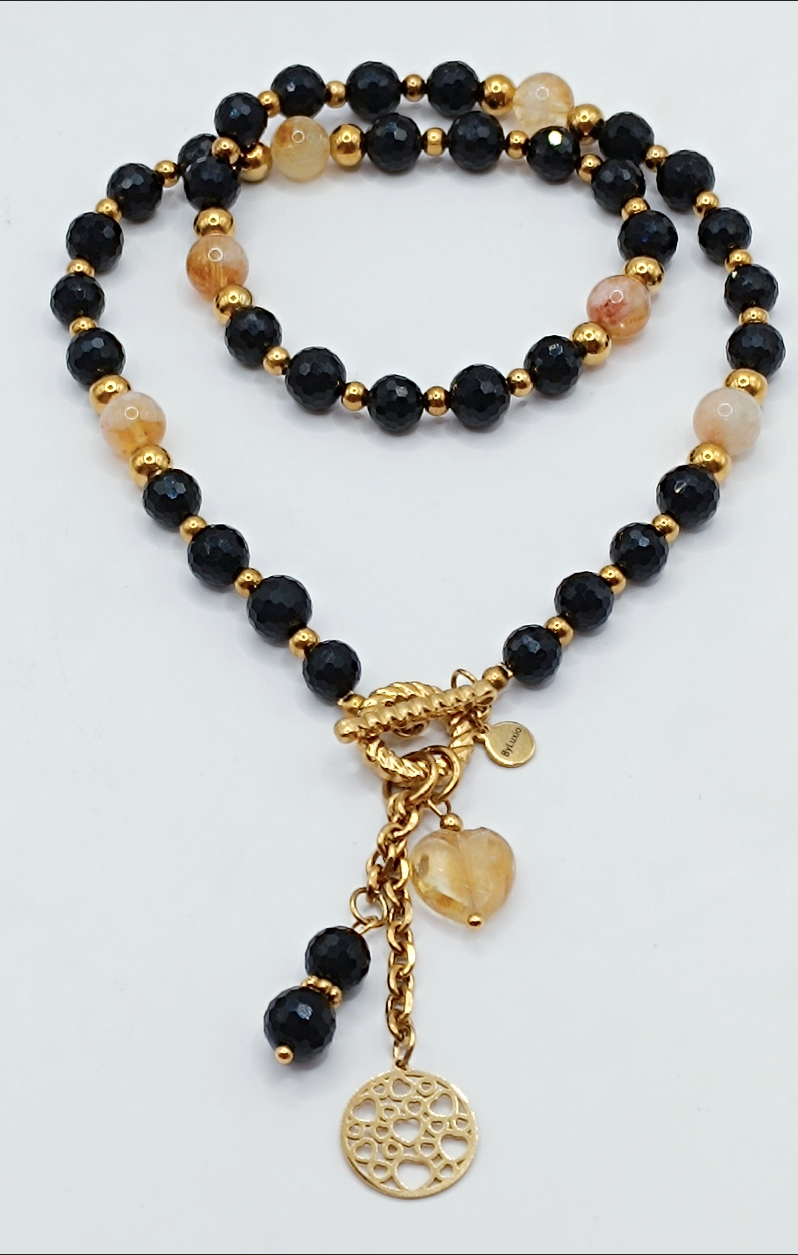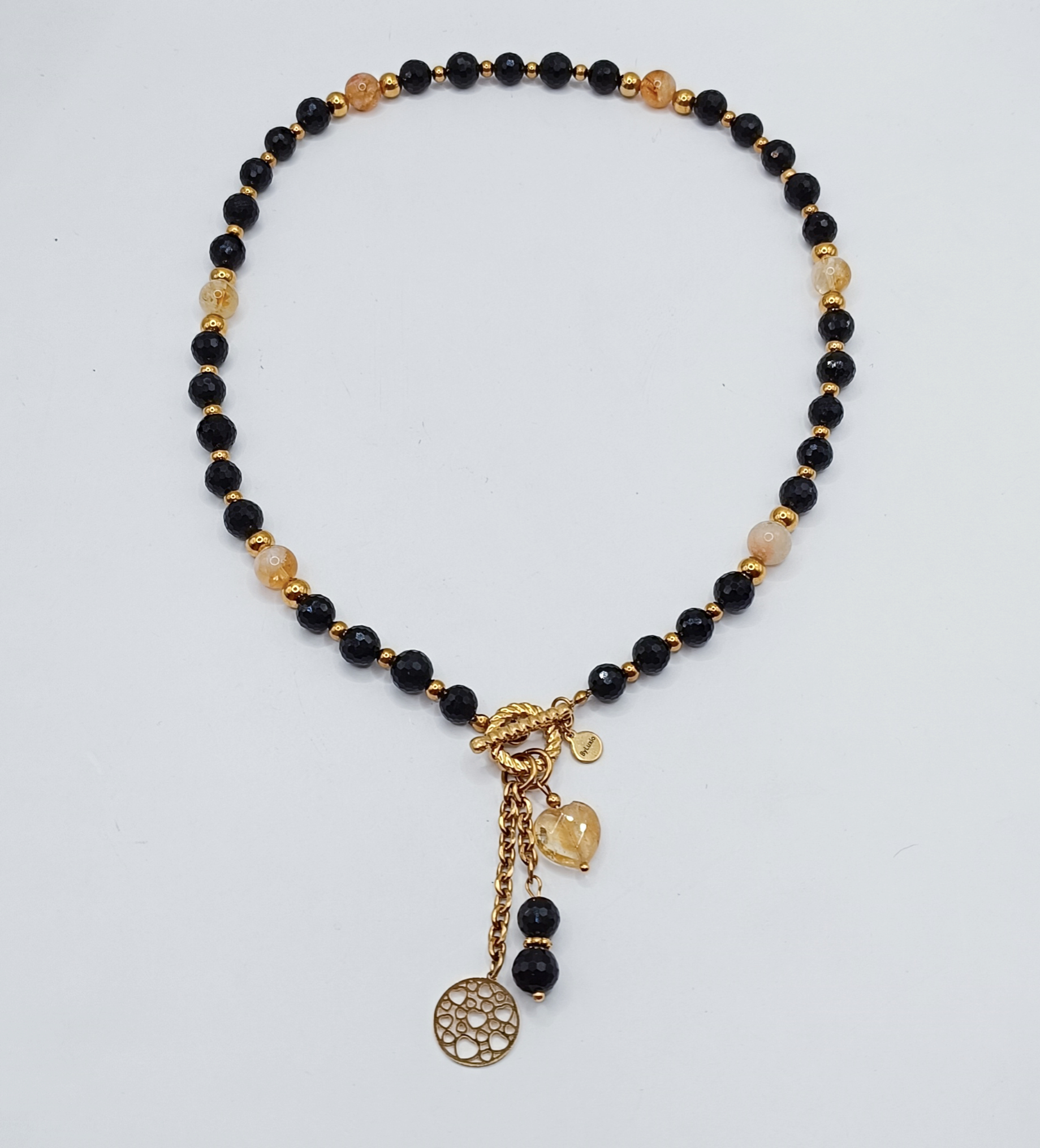 Naszyjnik wykonany z dużych kamieni 8mm Czarnego Turmalinu i Cytrynu.