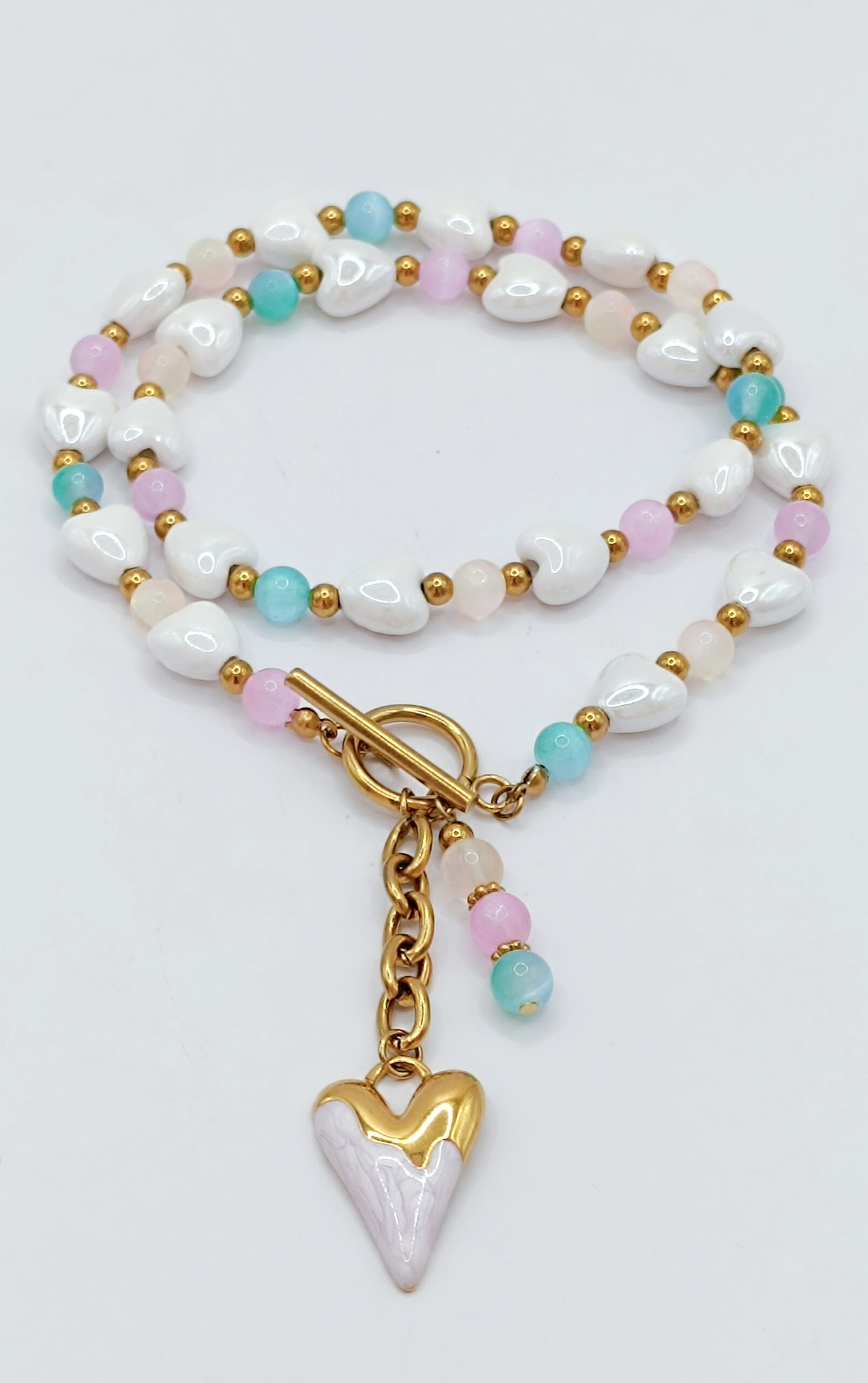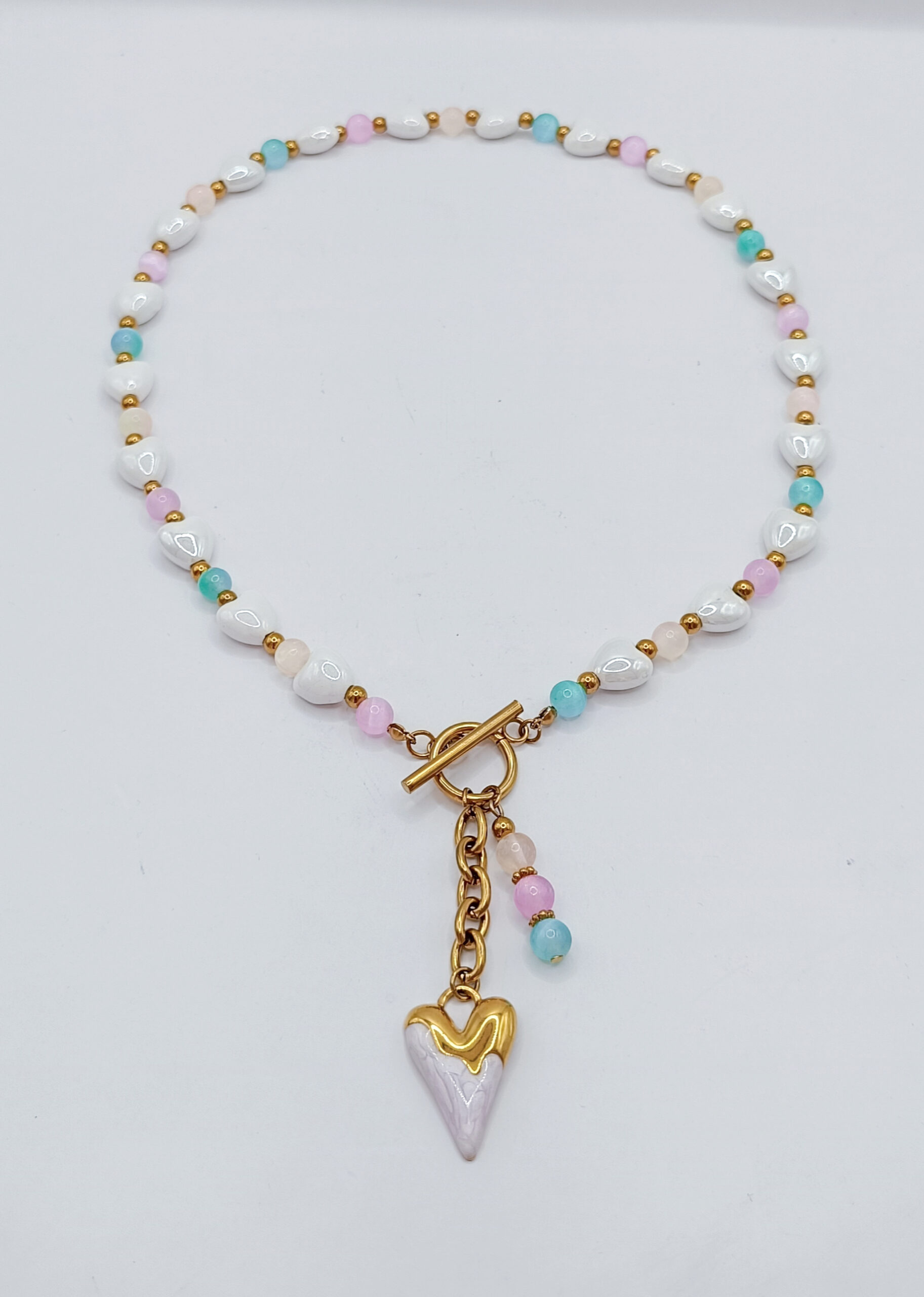 Naszyjnik wykonany z białych ceramicznych serduszek i kamieni Selenitu wielkości 6mm
