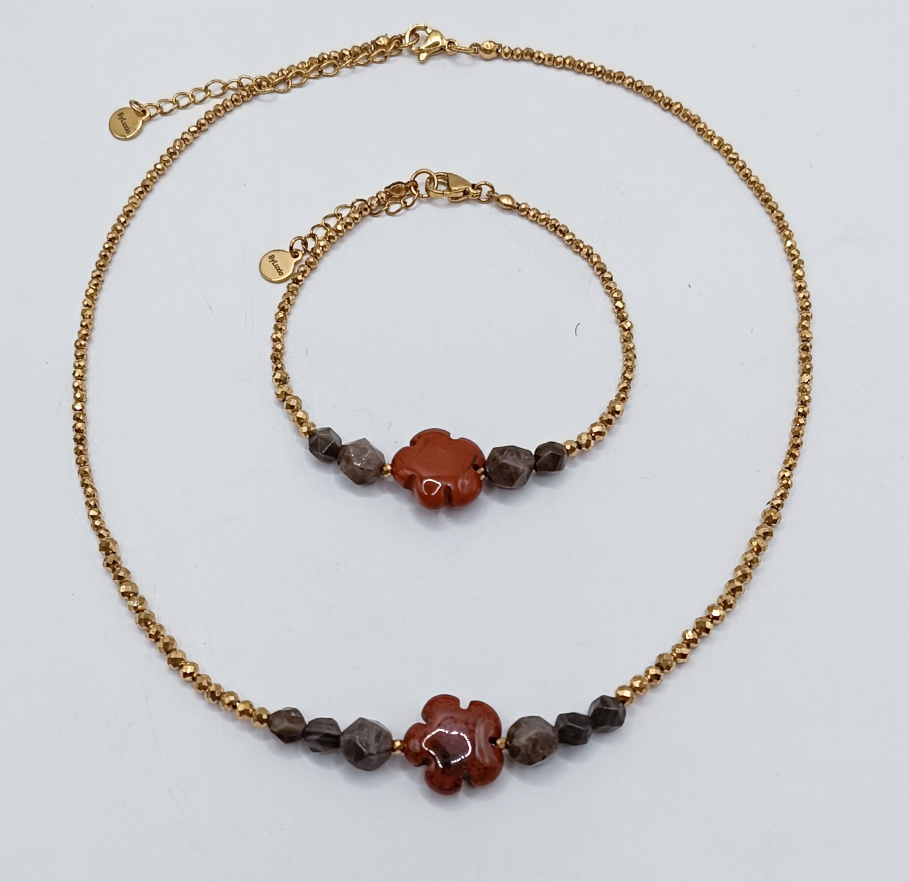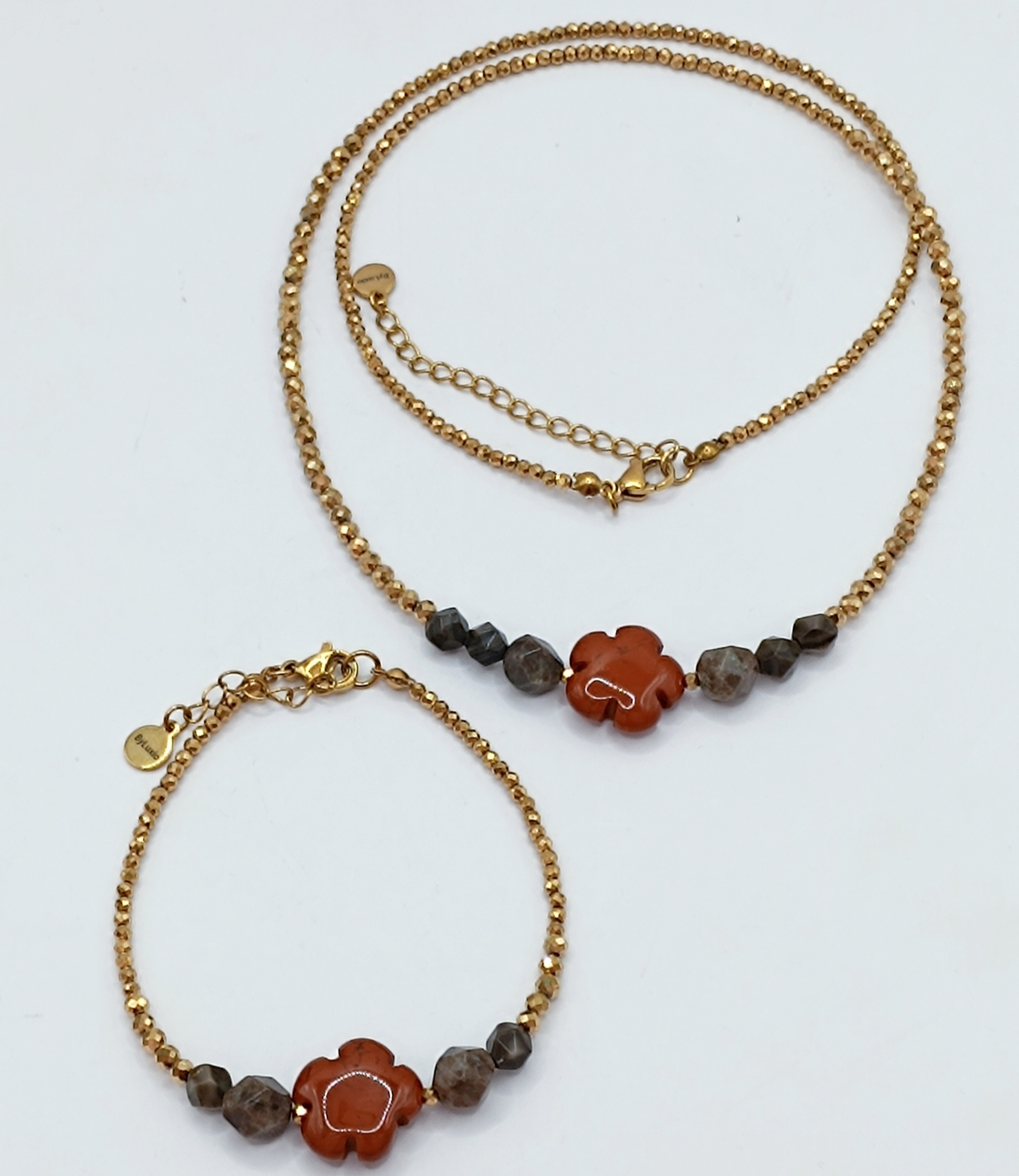 Naszyjnik wykonany, dwóch wielkości fasetowanych Hematytów oraz ozdobnych kamieni Jaspisu